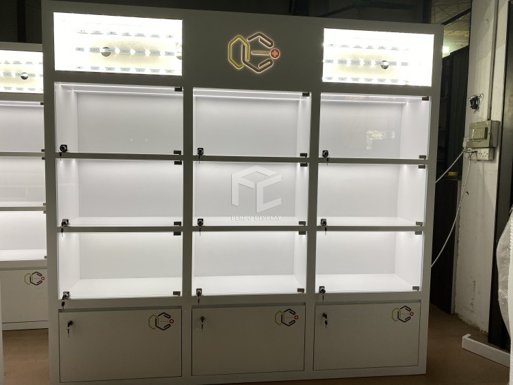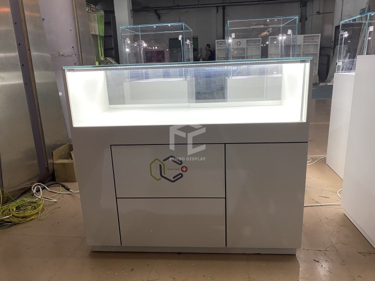 Questa vetrina è fatta da materiale del MDF, chiaro vetro temperato bianco ultra, con le luci principali del punto dentro. Ed anche con stoccaggio al fondo e con il logo.