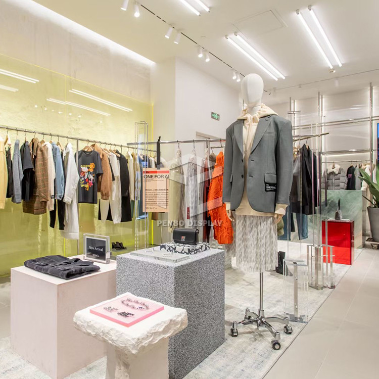 Gli scaffali diritti dei vestiti e gli scaffali di attaccatura di parete sono acciaio inossidabile dorato, fronte di specchio. La decorazione del negozio è semplice e generosa, ma anche risparmiare i soldi. L'esposizione di parete dei vestiti è multiforme, rende il negozio più bello e pratico.
